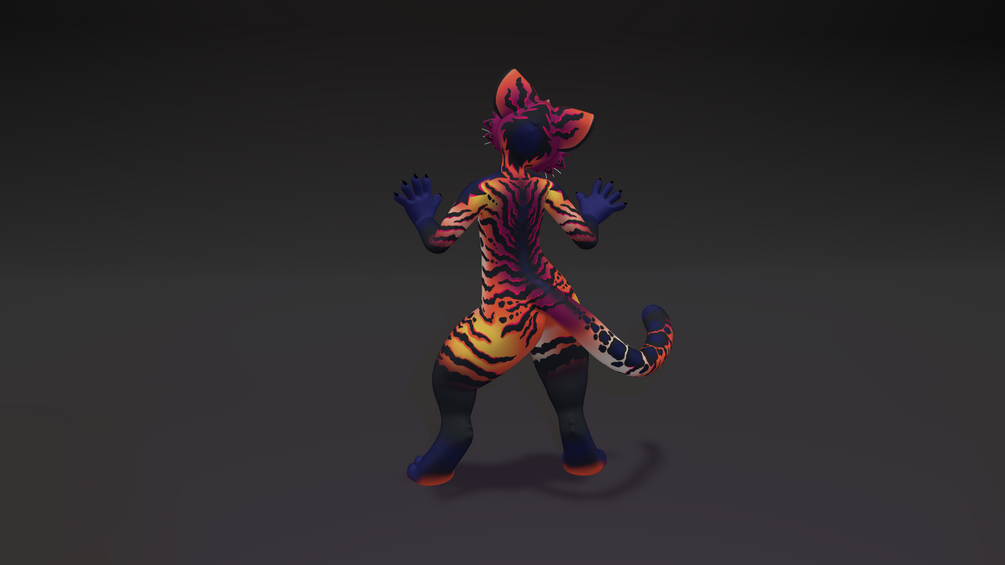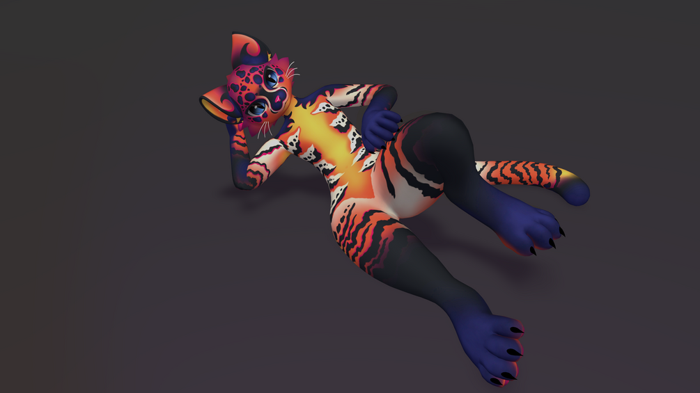 This texture has vibrant bright color, it really stands out in a crowd! its fur painted in shades of orange, blue, and pink that blend and swirl like a sunset. it is nice and striking to the eye, i hope you enjoy :)